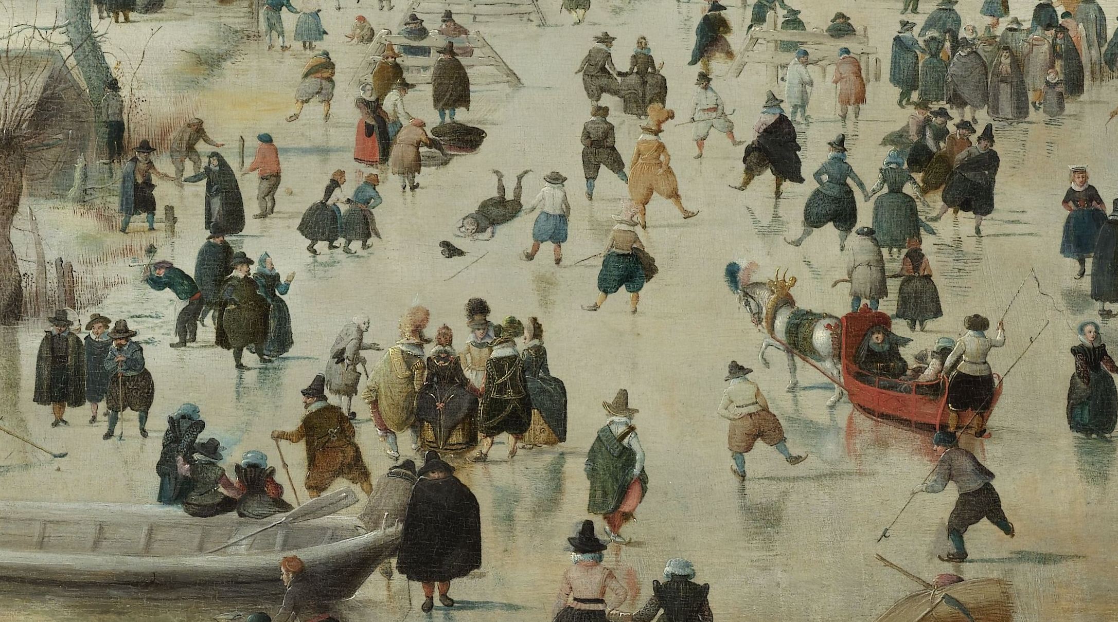 Winterlandschap met schaatsers (detail), Hendrick Avercamp, ca. 1608; olieverf op paneel (Rijksmuseum)